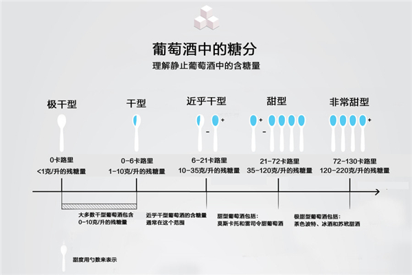 國際上還有一種通用的量化方法,那就是用勺數(shù)來表示,詳見下圖。一個標準勺為 1 盎司(約等于 28.35 克),如下圖所示,干型的殘?zhí)橇糠秶恍蜗蟮谋硎緸?0 勺到 1/3 勺之間,近乎干殘?zhí)橇康姆秶槐硎緸?1/3 勺至1勺+之間。