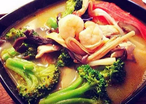 這是一道泰國名湯,世界十大名湯之一,將輔料放入桶煲至出味,而后放入大頭蝦、草菇、椰汁等一起燉煮,酸味鮮美開胃。這湯以色澤全紅、湯味馥郁可口而著稱。