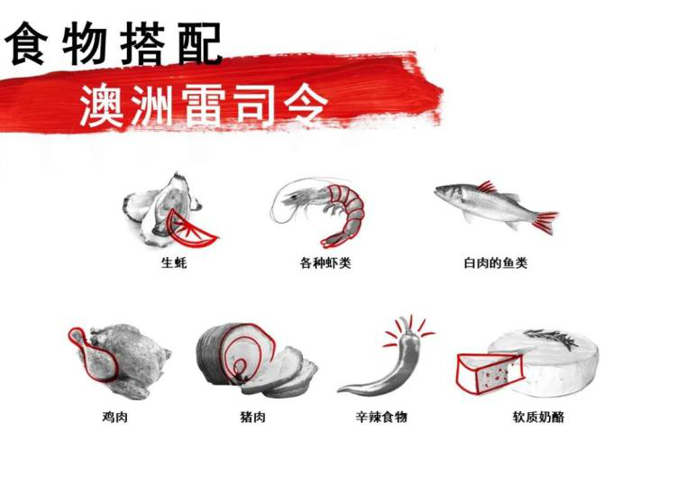 清爽,擁有檸檬-青檸風(fēng)味的干型雷司令:魚,貝類和甲殼類等海產(chǎn)是理想的搭配,特別是佐以檸檬、刺山柑、奶油醬汁或者亞洲調(diào)味汁時(shí)。雞肉和豬肉類菜肴能很好的和中度酒體風(fēng)格的雷司令搭配。