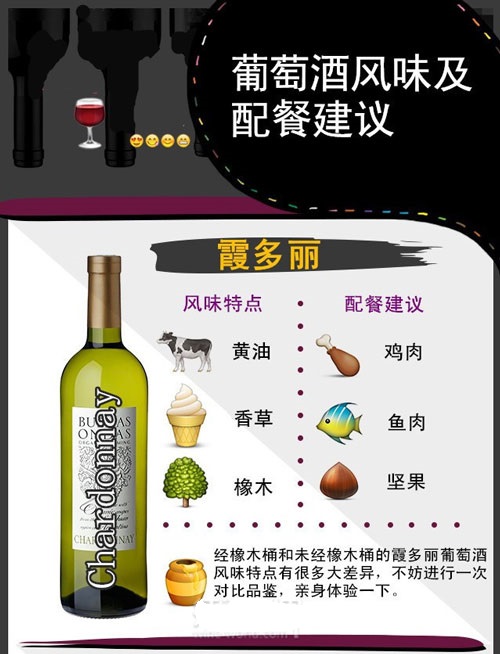 東莞藍菲城堡葡萄酒代理商用6張圖片列出最主要的6種葡萄酒,并簡要說明相應的風格特點和配餐建議。比如稱得上“千面女郎”的霞多麗葡萄酒,即可以清新脆爽,也可以豐滿順滑,而決定其風格的,除品種本身外,還有釀酒工藝,尤其是橡木桶的使用。【