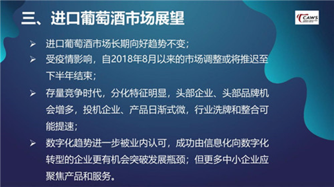 調整期被延長,進口葡萄酒市場格局競爭更為激烈。 需要注意的是,自2018年8月開始,中國葡萄酒市場進入到調整期。由于受到2020年疫情的影響,整個調整期結束時間將被延長,至于何時能結束,與當下疫情防控工作的進展緊密相關。如果防控進展較為理想,我認為在今年下半年開始,市場將逐漸恢復。