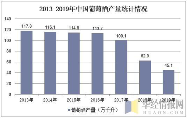 然而,目前中國(guó)的葡萄酒產(chǎn)業(yè)發(fā)展并不成熟,隨著我國(guó)國(guó)民生活質(zhì)量的提高,對(duì)高端葡萄酒需求增加,進(jìn)口葡萄酒快速蠶食國(guó)產(chǎn)葡萄酒市場(chǎng)份額,近年來(lái)中國(guó)葡萄酒產(chǎn)量持續(xù)下降,2019年中國(guó)葡萄酒產(chǎn)量達(dá)45.1萬(wàn)千升,與2018年相比減少了17.8萬(wàn)千升。