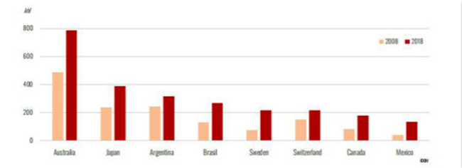 這六大全球起泡酒消費國所占份額由2008年的76%下降到了2018年的70%。與此同時,全球涌現出了一些新興起泡酒消費國。按平均年度增長率排名依次為:墨西哥(13%)、瑞典(11%)、加拿大(8%)、巴西(8%)、日本(5%)、澳大利亞(5%)、瑞士(4%)、阿根廷(3%)。