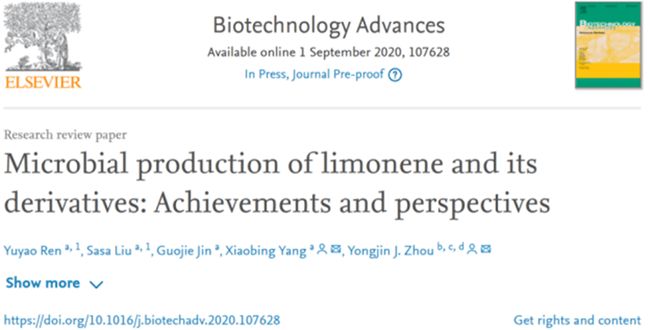 近日,葡萄酒學院楊曉兵副教授團隊在著名生物技術(shù)學術(shù)期刊《Biotechnology Advances》(IF=10.744)發(fā)表了題為 “Microbial production of limonene and its derivatives: Achievements and perspectives” 的綜述文章,系統(tǒng)總結(jié)了近年來利用代謝工程和合成生物學策略合成檸檬烯及其衍生物研究進展。西北農(nóng)林科技大學為第一署名單位,中科院大連化學物理研究所為合作單位;16級本科生任毓瑤和18級博士研究生劉灑灑為共同第一作者,我校楊曉兵副教授與大連化物所周雍進研究員為共同通訊作者,我校靳國杰副教授參與了該綜述的撰寫工作。《Biotechnology Advances》是生物技術(shù)領(lǐng)域頂級國際期刊,在105種應用微生物與生物技術(shù)相關(guān)的雜志中排名第3,該雜志全年收錄文章在100篇左右,2019年H指數(shù)161。