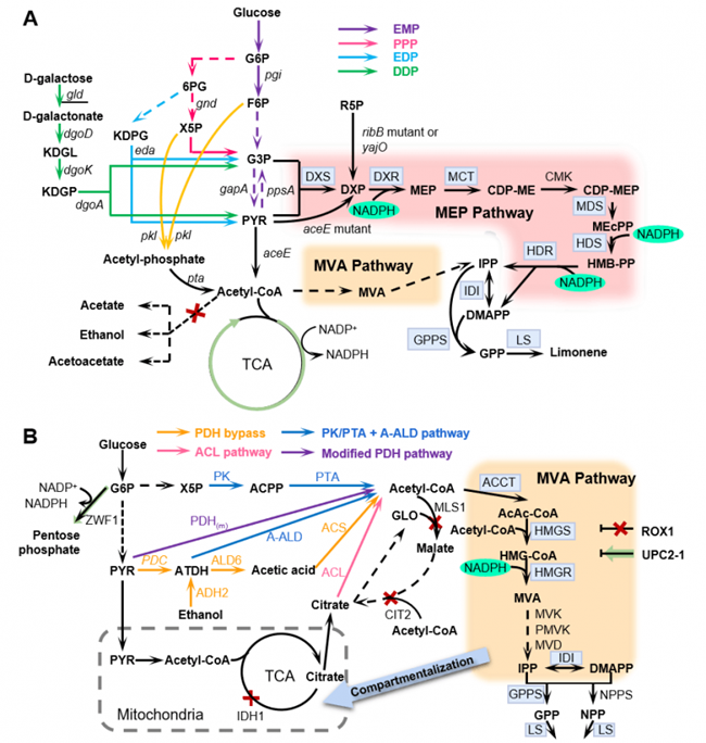 楊曉兵副教授團隊長期致力于利用代謝工程和合成生物學策略構(gòu)建高價值化合物細胞工廠的研究工作。目前,已利用代謝工程策略成功改造圓紅冬孢酵母(Rhodosporidium toruloides)構(gòu)建了檸檬烯等單帖化合物、羥基化脂肪酸、氨基酸衍生物的細胞工廠,其中檸檬烯微生物合成相關(guān)研究工作獲得陜西省面上基金(2020JM177)、學校科研啟動基金、國家級科創(chuàng)等支持,指導2016本科生任毓瑤畢業(yè)論文獲得校級畢業(yè)論文。該綜述介紹了微生物合成檸檬烯及其衍生物面臨的機遇與挑戰(zhàn),詳細闡述了異戊二烯途徑多樣性、代謝路徑關(guān)鍵酶的發(fā)掘與表征、宿主細胞代謝路徑的理性調(diào)控、輔因子平衡、檸檬烯及其衍生物生物毒性的解除及提升宿主微生物魯棒性的策略等內(nèi)容。本綜述詳盡討論了大腸桿菌、釀酒酵母、藍細菌和產(chǎn)油酵母等生產(chǎn)平臺菌株的優(yōu)勢與不足,為系統(tǒng)地理性改造微生物代謝網(wǎng)絡構(gòu)建單帖細胞工廠提供了科學參考。