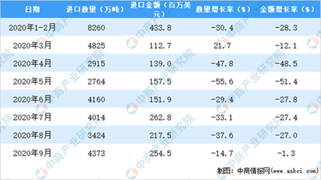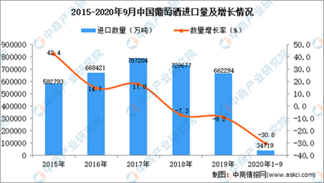數(shù)2020年1-9月中國葡萄酒進口量及金額增長情況