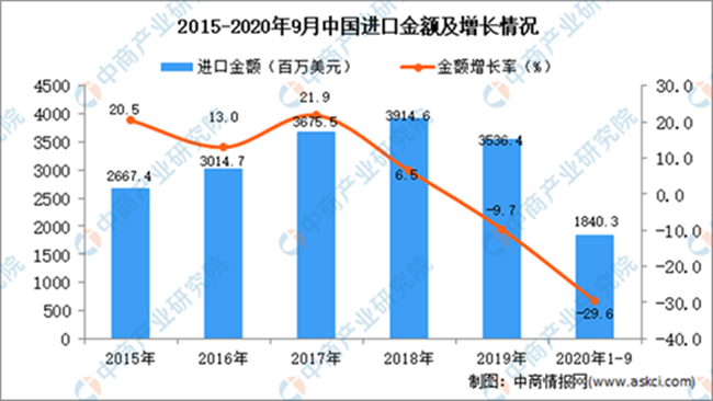 從金額方面來看,2020年1-9月中國葡萄酒進口金額為1840.3百萬美元,同比下降29.6%。