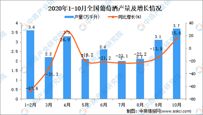 據(jù)中商產(chǎn)業(yè)研究院數(shù)據(jù)庫(kù)顯示,2020年10月全國(guó)葡萄酒產(chǎn)量增長(zhǎng),2020年10月全國(guó)葡萄酒產(chǎn)量為3.7萬(wàn)千升,同比增長(zhǎng)15.6%。2020年1-10月全國(guó)葡萄酒產(chǎn)量為32萬(wàn)千升,同比增長(zhǎng)4.6%。