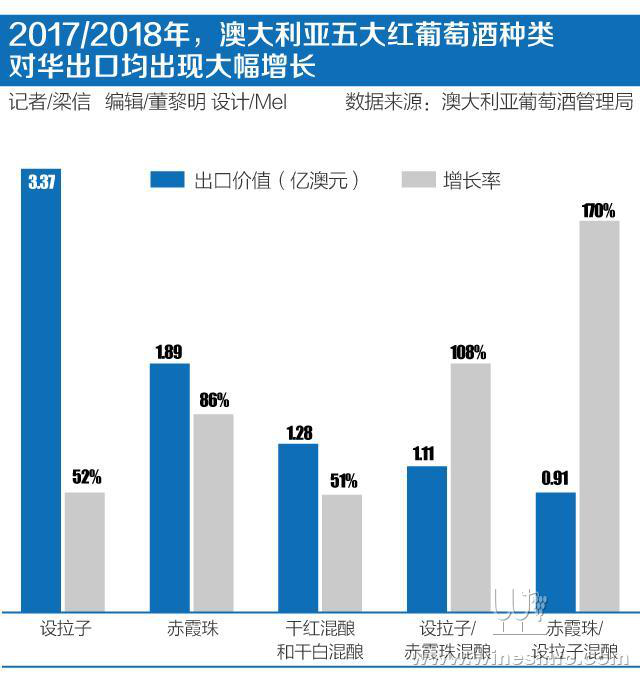 2017/2018年,澳大利亞五大紅葡萄酒種類對華出口均出現大幅增長。設拉子增長52%至3.37億澳元,赤霞珠增長86%至1.89億澳元,干紅混釀和干白混釀增長51%至1.28億澳元,設拉子/赤霞珠混釀增長108%至1.11億澳元,赤霞珠/設拉子混釀增長170%至9100萬澳元。