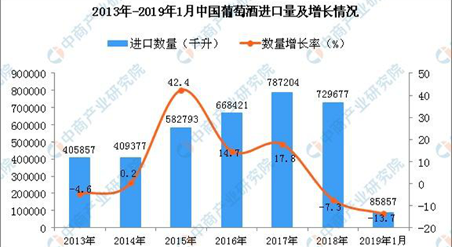 據(jù)中商產(chǎn)業(yè)研究院數(shù)據(jù)庫(kù)顯示,2013年-2017年中國(guó)葡萄酒進(jìn)口量增長(zhǎng),共增長(zhǎng)381347千升,增長(zhǎng)93.96%;2018年中國(guó)葡萄酒進(jìn)口量回落,2019年1月中國(guó)葡萄酒進(jìn)口量為85857千升,同比下降13.7%。