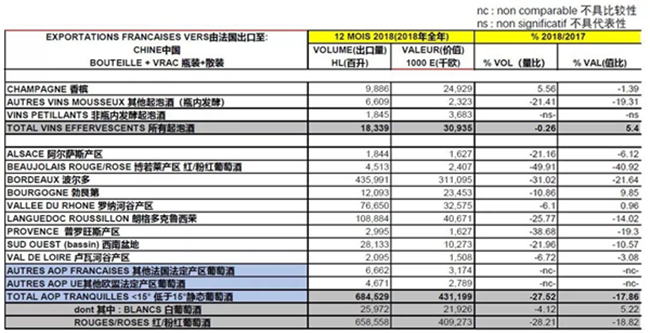 根據WBO發布的2018年法國各產區葡萄酒進出口中國大陸地區的數據顯示,去年幾乎大部分產區出口中國的量額出現下跌。