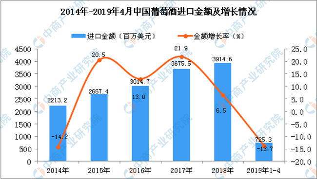 從金額方面來看,2013年-2014年中國葡萄酒進(jìn)口金額有小幅度下降,2015年-2018年中國葡萄酒進(jìn)口金額增長;2019年1-4月中國葡萄酒進(jìn)口金額為725.3百萬美元,同比下降13.7%。