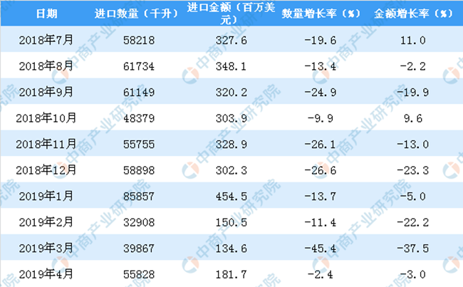 2018年-2019年4月中國葡萄酒進(jìn)口數(shù)量及金額增長率情況