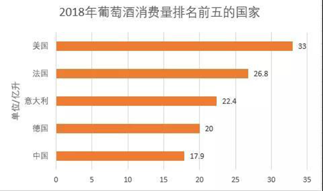 從葡萄酒消費(fèi)量來(lái)看,2018年全球葡萄酒消費(fèi)量246億升,基本與上一年持平。從各國(guó)情況來(lái)看,美國(guó)仍然是全球最大的葡萄酒消費(fèi)國(guó),消費(fèi)量為33億升。其次是法國(guó)(26.8億升)、意大利(22.4億升)、德國(guó)(20億升),中國(guó)以17.9億升位居第五。