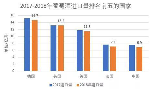 2018年葡萄酒進(jìn)口排名前五的國(guó)家分別是德國(guó)(14.7億升)、英國(guó)(13.2億升)、美國(guó)(11.5億升)、法國(guó)(7.1億升)和中國(guó)(6.9億升),占2018年全球葡萄酒進(jìn)口量的一半以上。