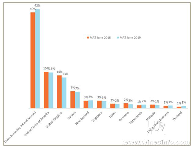 澳大利亞葡萄酒管理局(Wine Australia)近期發布了截至2019年6月的12個月的出口報告,報告顯示2018-2019財年澳洲對中國(包括香港和澳門)的葡萄酒出口創下了最新記錄,出口值增長了7%,達到12億澳元。