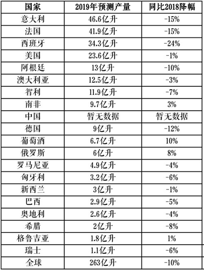 據國際葡萄與葡萄酒組織(OIV)最新數據顯示,2019年全球葡萄酒產量為263億升(mhl),同比2018年下降了10.54%。