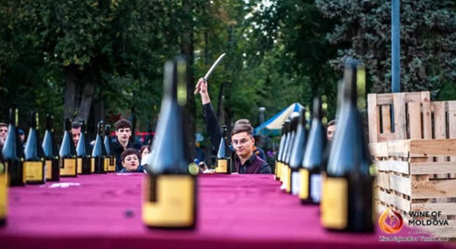 附加信息:摩爾多瓦侍酒師Daniel Frumusachi最近表演了“砍香檳”特技,被載入了吉尼斯世界紀錄。9月19日,他的第一項紀錄被吉尼斯世界紀錄認證(他在30秒內打開了49瓶酒),他正在等待第二項紀錄的認證:在1分鐘內打開了79瓶酒(上一次記錄是由Raimond Thomson創造,1分鐘內打開了71瓶酒)。圖為在國家葡萄酒節上,他在葡萄酒大師班上表演的“砍香檳”特技。