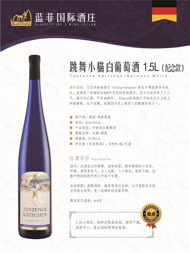 酒體呈淺檸檬黃色,擁有精致的小白花、檸檬、青蘋果香氣,令人沉醉;酒體輕盈,入口清爽,甜而不膩,優雅平衡的結構呼喚口中每個味蕾。1.5L大瓶型,獨特優雅藍瓶型,最少適合各式各樣的聚會盛典,可搭配海鮮、蔬菜等清淡食物,也可搭配飯后甜點,甜而不膩,清爽可口,是一款隨和的佐餐用酒。